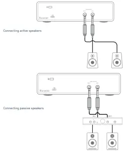 The line outputs are 3-pole (TRS) ¼” (6.35 mm) jack sockets, and are electronically balanced. Typical consumer (Hi-Fi) amplifiers and small active monitors have unbalanced inputs, either on phono (RCA) sockets, or a 3.5 mm TRS jack plug to connect to a computer. In either case, use a suitable connecting cable with jack plugs at one end.