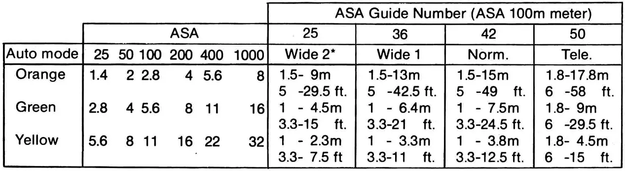If, for example, you wish to take informal portraits in your home, the flash range needed might be only lm (3 ft.) to 3m (10 ft.). Using ASA 100 film, your choice of auto f-number would be one of f/2.8 for orange auto setting, f/5.6 for green, or f/11 for yellow setting.