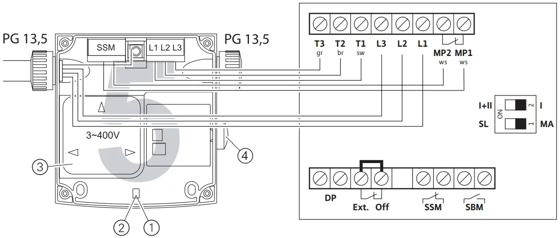 | DIP Switch1: MA DIP Switch2: I Allocate terminals to Ext. Off | DIP Switch1: MA | DIP Switch1: SL |