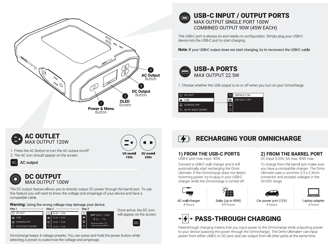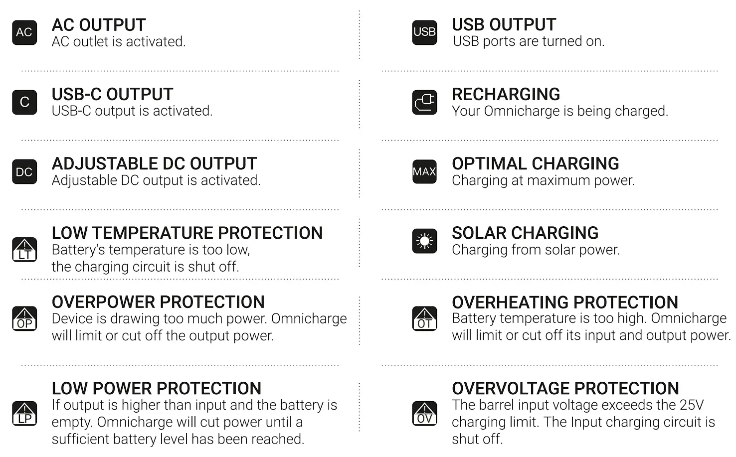 Omnicharge products with AC output generate the same potentially lethal AC power as a normal household wall outlet. Please use it carefully just like using a normal AC wall outlet. DO NO insert foreign objects into outputs or ventilation holes. - DC Output