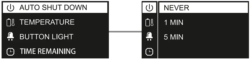 Set the screen auto shut-off time here. The default setting is 5 min.