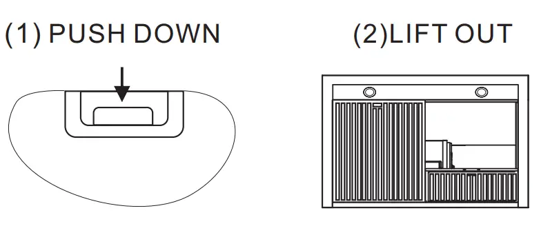 - Remove the grease filter one by one by pushing down each latch. This will disengage the filter from the hood. Tilt the filter downward and remove it.