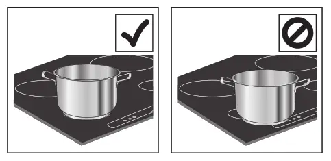 To ensure optimum efficiency, always use pots and pans with a flat bottom that distributes the heat evenly. If the bottom is uneven, this will affect power and heat conduction.
