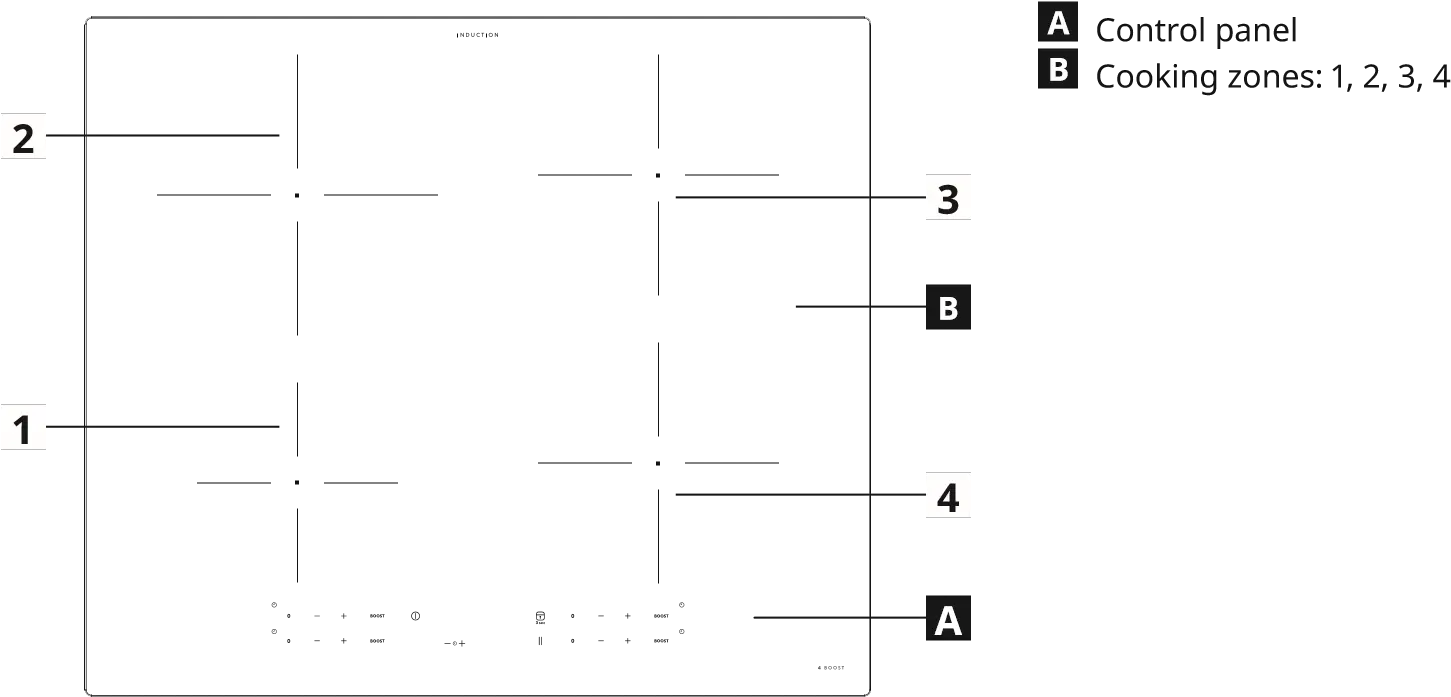 Press the + or – button of the required cooking zone to activate it and adjust the power. The level will be shown in line with the area, along with the indicator light identifying the active cooking zone. The “BOOST“ button can be used to select the quick heating function.