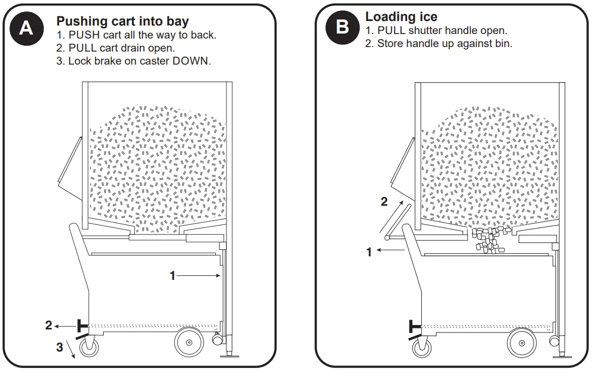 - To avoid placing lid on floor, position lid horizontally on cart lip, resting lid against cart handle when unloading ice from cart.