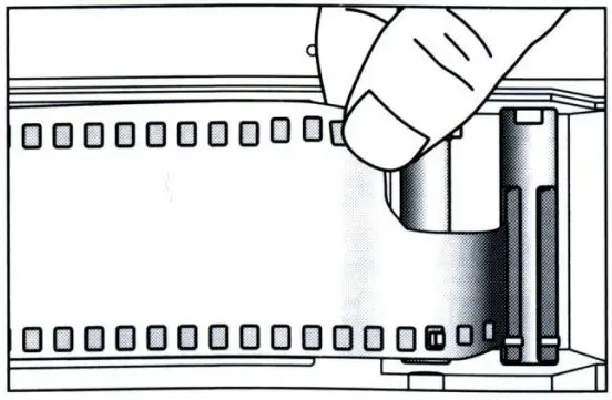 Insert the film leader into the grooves of the Film Take-up Spool (32) and place it so that the sprockets engage the - film edge perforations.