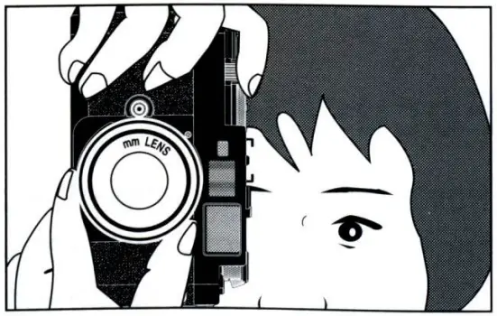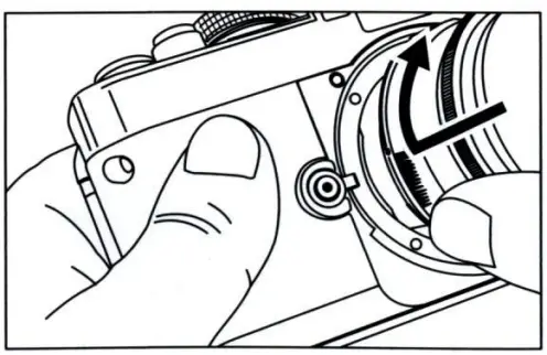 3. Press your right elbow lightly against your body and then look through the rangefinder eyepiece to steady the camera against your face. Then relax your right arm holding the camera.