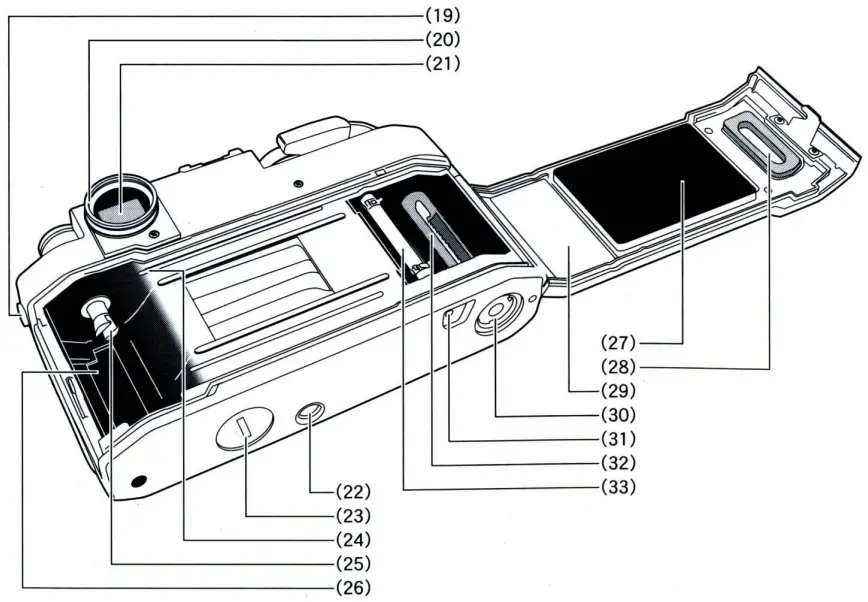 - To. open the Back Door (29), unfold and lift the Film Rewind Crank(l 1) up, then pull the Film Rewind Knob(l 2) up while holding the Backdoor Lock Lever(l 4) in the release position. When the Back Door is opened, the Film Counter (6) will automatically reset to “S.” Insert the film cartridge into the Film Cartridge Chamber