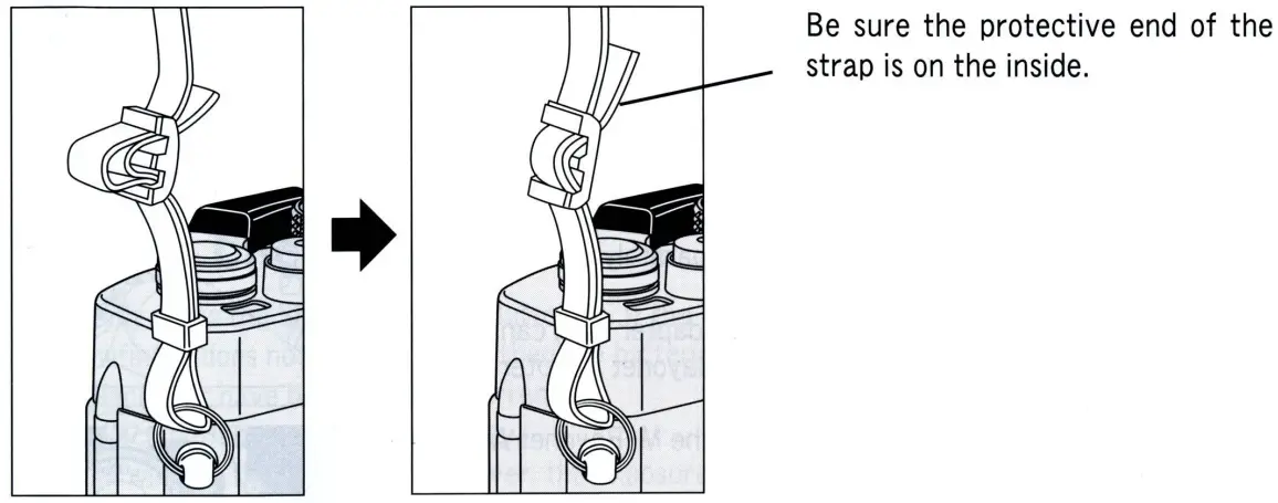 Attach the neck strap to the camera as illustrated below.