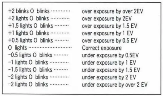 How the viewfinder LED shows over-exposure, correct exposure, or under exposure: