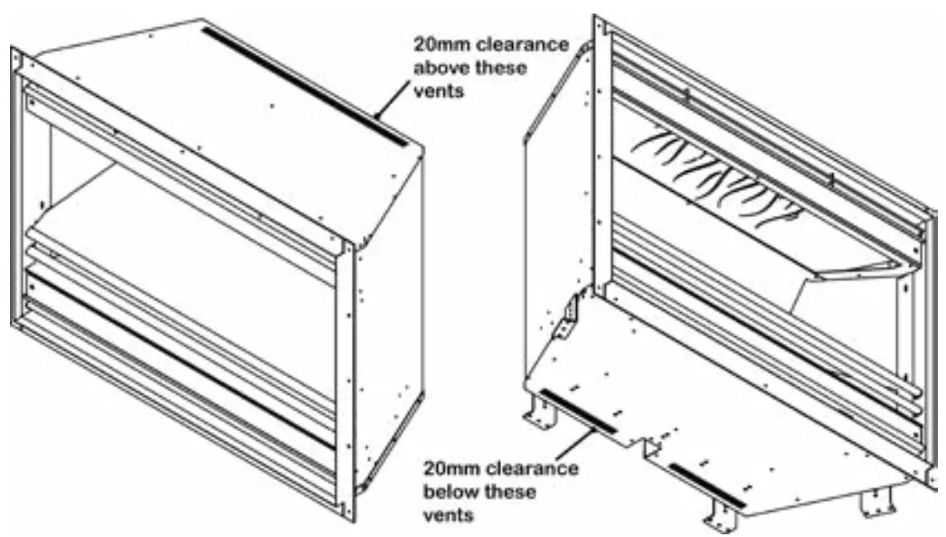 When constructing the studwork, remember that the vents on the underside of the appliance need a minimum of 50mm clearance beneath them. Ensure that the appliance isn’t supporting the weight of the studwork. Do not use silicones, adhesives, or wet plaster to seal in the appliance. Before plasterboarding in the appliance it is recommended that you create a maintenance hatch for future access. - Your plasterboard can now line up with the plaster kits on the edge of the