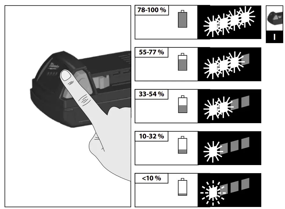 Do not dispose of used battery packs in the household refuse or by burning them. Milwaukee Distributors offer to retrieve old batteries to protect our environment. Do not store the battery pack together with metal objects (short circuit risk). Use only System C18 chargers for charging System C18 battery packs. Do not use battery packs from other systems. No metal parts must be allowed to enter the battery section of the charger (short circuit risk). Never break open battery packs and chargers and store only in dry rooms. Keep dry at all times. Battery acid may leak from damaged batteries under extreme load or extreme temperatures. In case of contact with battery acid wash it off immediately with soap and water. In case of eye contact rinse thoroughly for at least 10 minutes and immediately seek medical attention.