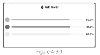 Pekoko comes with imported tri-color ink cartridges. The ink cartridge consumption is closely related to the printing content. If one of the tri-colors ink is run out, please replace the original ink cartridge as soon as possible to promise good printing. The ink volume display is shown in Figure 4-3-1.