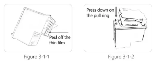 - Remove the ink cartridge and peel off the nozzle seal film from the ink cartridge, as shown in Figure 3-1-1.