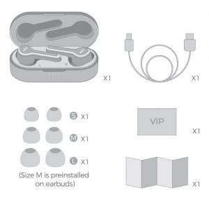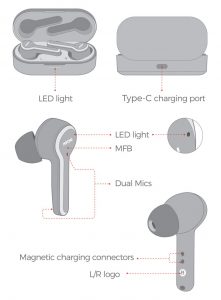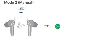 - In the shutdown status when the earphones are not the charging case, simultaneously press and hold the MFB of both earbuds for 2 second to power on ( with the blue LED light flashing).