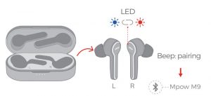 Take out the earphones they automatically enter the paiñng mode when the blue and red lights start flashing alternately, and then select”Mpow M9”.