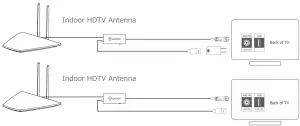 - Connect the coaxial cable attached to the antenna to the ANTENNA/CABLE IN connector on the back of the TV or converter box. Connect the USB cable between the DC socket in the Smartpass Amplifier and an open USB port with DC SV output on the back of the TV. If the TV does not have a USB port with DC SV output, use the included power adapter to power the Smartpass Amplifier via wall outlet.
