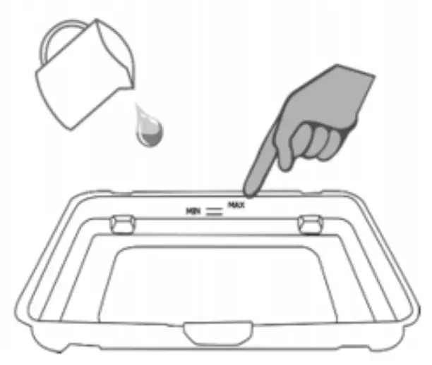 – Pour a little water into the tank. The water level must be between MIN and MAX.