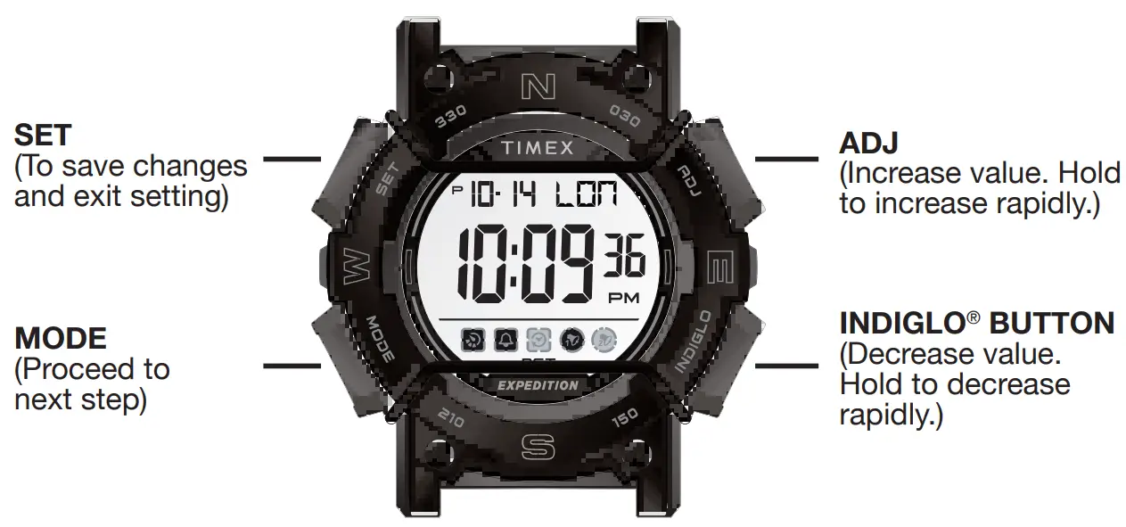 - Press ADJ to advance the setting or press INDIGLO to reverse the setting. Press and hold to increment quickly.