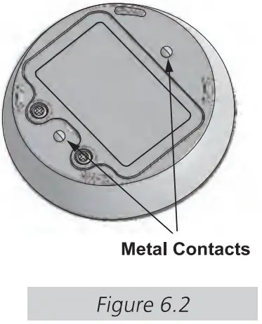 Option 2 (Full device reset): Using a metal screwdriver or paper clip apply a direct short to the two metal contacts on the bottom of the device three times within two seconds (See Figure 6.2).