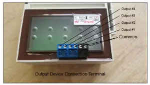 Wiring the 3 and 4 output would entail connecting the green wire for the 3rd output device to terminal 5 (blue block) and the green wire for the 4th output device to terminal 6 (blue block). The black wires from both output devices would connect to either terminal 1 or 2 (the black blocks).