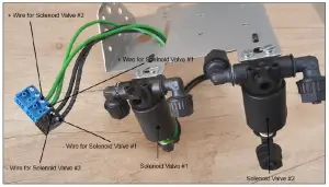 Figure 8 below shows two solenoid valves that have wire to the radio receiver modules terminal plug. The green wire (plus) from solenoid valve #1 is wired to the first blue terminal (terminal 3 being the closest blue terminal to the black terminals). The green wire (plus) from solenoid valve #2 is wired to the second blue terminal (terminal 4). The black wires (minus) are wired to the black terminals in no specific order. The two black terminals are the same.