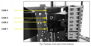 The opening or closing signal comes when the blue cams push the auxiliary electromechanical limit switch on the logic board. The cams adjustment procedure is described on paragraph 6.6.