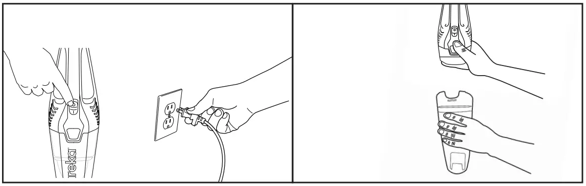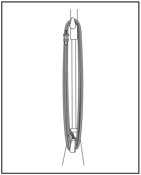 Wrap cord around the upper and lower cord wraps on the back of the vacuum. Clip plug onto the cord.