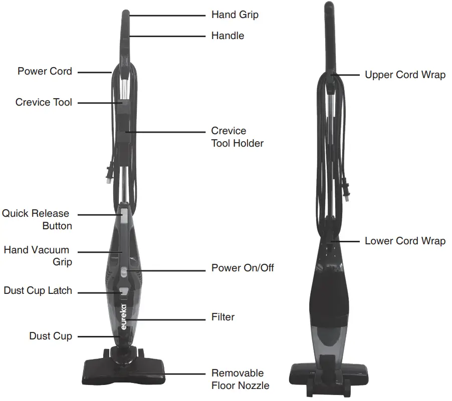 - Do not use with damaged cord or plug. If vacuum cleaner is not working as it should, has been dropped, damaged, left outdoors, or dropped into water, call the Eureka Customer Service HELPLINE at 1-800-282-2886.