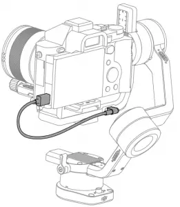 The camera control button accesses different functions depending on the camera model. Connect the provided camera control cable to the camera control port on the gimbal and camera.