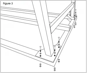 - Align holes on corner plates of upright frame with holes on base. Use three M10 x 70 hex bolts, three M10 hex nuts, three M10 spring washers and three M10 washers to attach each corner plate of upright frame to base. (See Figure 3)