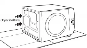Partially install two of the #12 x 5/8″ hex-head sheet metal screws in the indicated holes. Leave a space of about 3/8″ (10 mm) between the screw head and the bottom of the dryer.