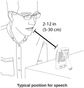 Set the microphone to the Speech mode. Speak directly into the front of the microphone at a distance of 2-12 inches (5-30 cm) away. Speaking closer to the microphone results in more bass response, similar to voices on a radio broadcast. Make additional gain adjustments if necessary.