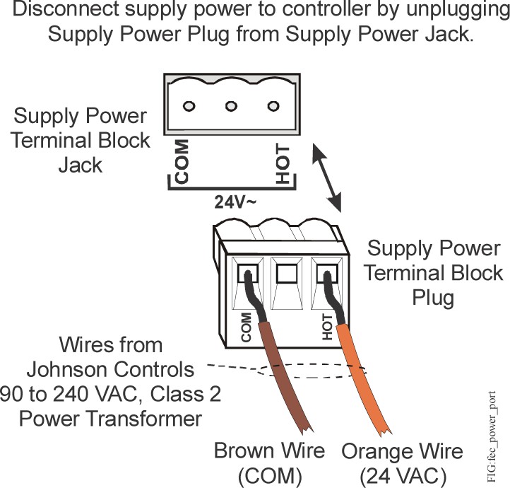 Wire the 24 VAC supply power wires from the transformer to the HOT and COM terminals on the terminal plug, as shown in the following figure. The middle terminal on the supply power terminal block is not used.
