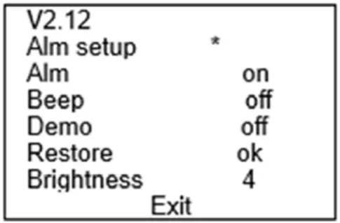 - To turn on the alert, scroll to the „Alm“ line and hold down the control button until „on“ is set. To turn off the alert, proceed in the same way and set to „off“.