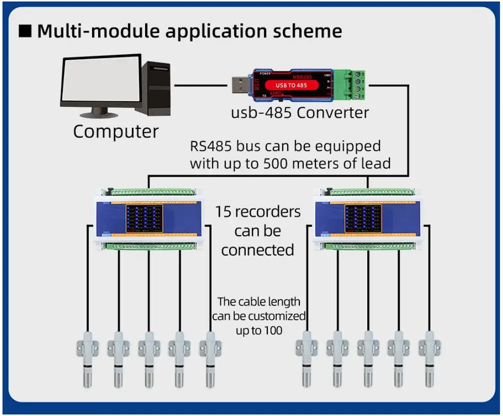 QR1213B using the standard RS485 bus MODBUS-RTU protocol,easy access to PLC,DCS and other instruments or systems for monitoring temperature,humidity@12 state quantities.The internal use of high-precision sensing core and related devices to ensure high reliability and excellent long term stability,can be customized RS232, RS485, CAN,4-20mA, DC0~5V\10V, ZIGBEE, Lora, WIFI, GPRS and other output methods.