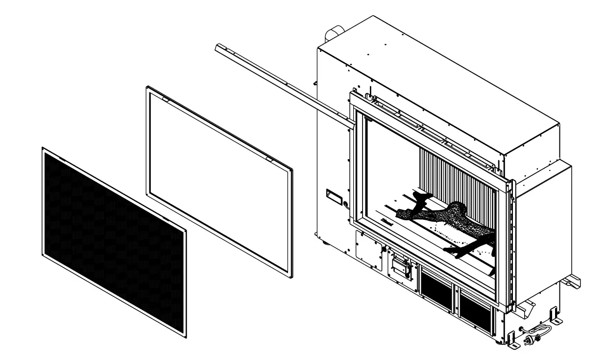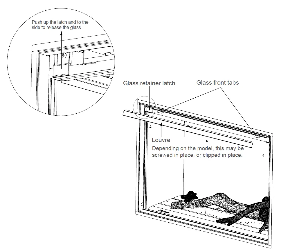 The glass front sits in a narrow channel at the bottom of the fire and is held in place by glass retainer latches positioned at the top, either side of the unit (the 1500 model has an extra glass retainer latch in the center).