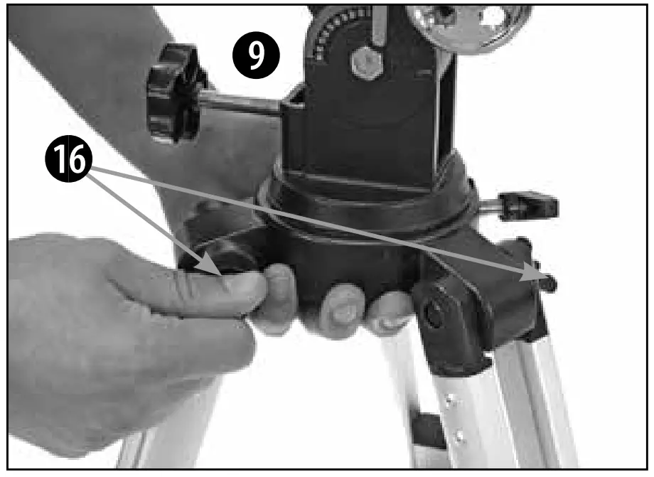 The locking screws (15) are then inserted into the tripod legs and tightened.