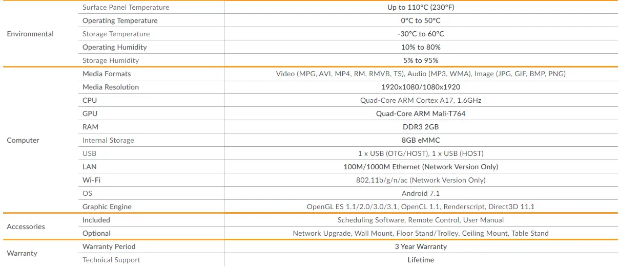 The integrated Android media player allows you to easily update on-screen content via USB plug-and-play. Alternatively, upgrade your screen to be networked without needing any additional hardware to unlock our cloud-based CMS software. Third-party software can be installed instead if required.