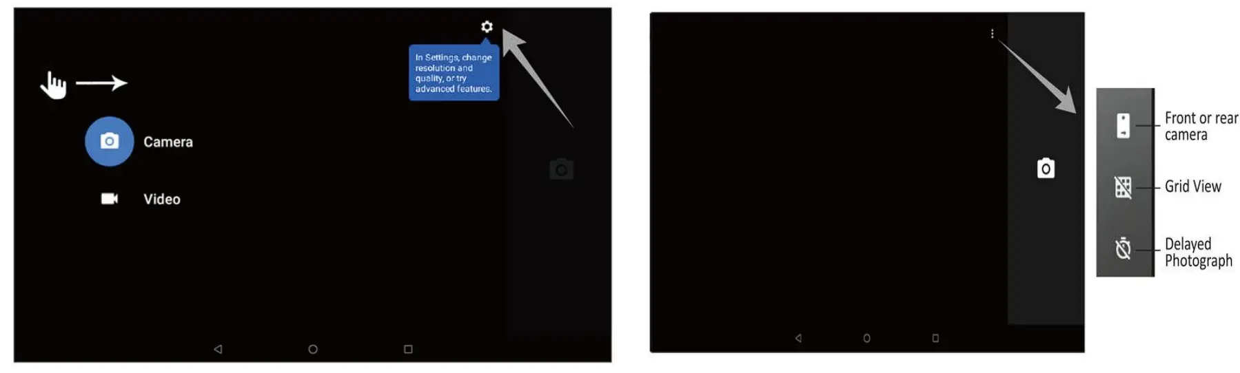 The camera app can be accessed from both Kid’s Place and Grown-ups. Note: photos taken from the camera are accessible to Grown-ups and Kid’s Place. Swipe from left to right on the screen, you can choose the Settings is on the top right corner. photo or video options