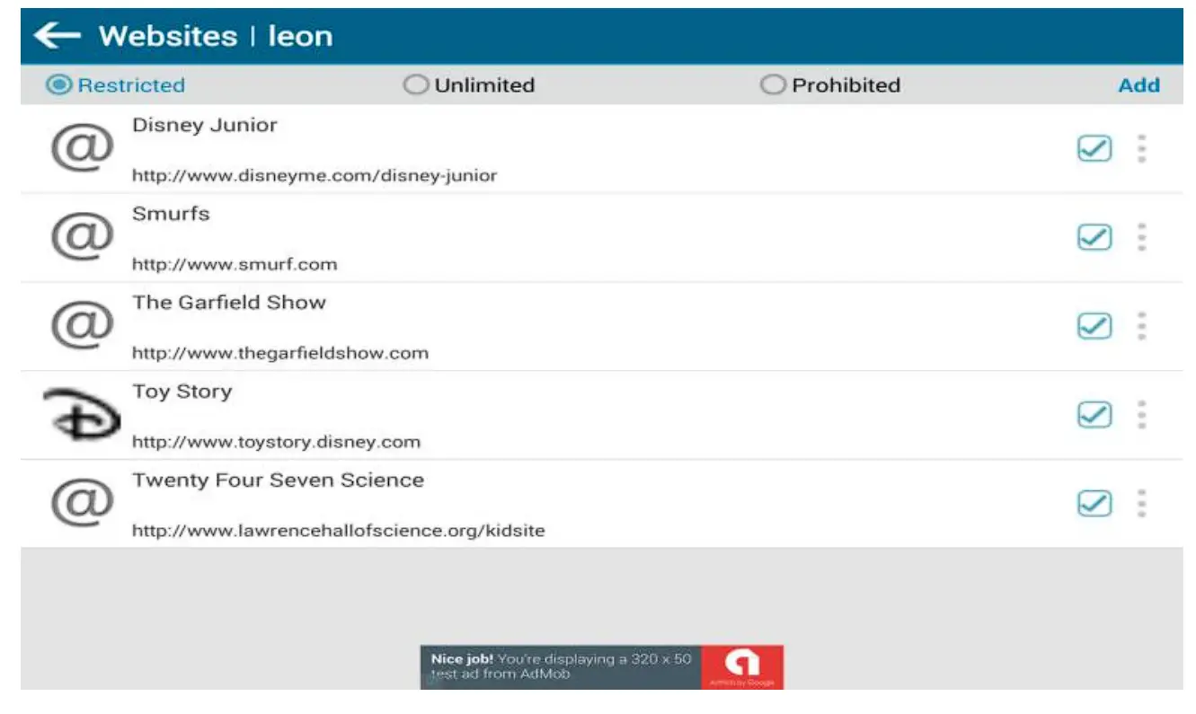 Select Websites for Kids Place; You may enable/disable internet access for Apps, you can also add websites by clicking “Add” on the right corner.