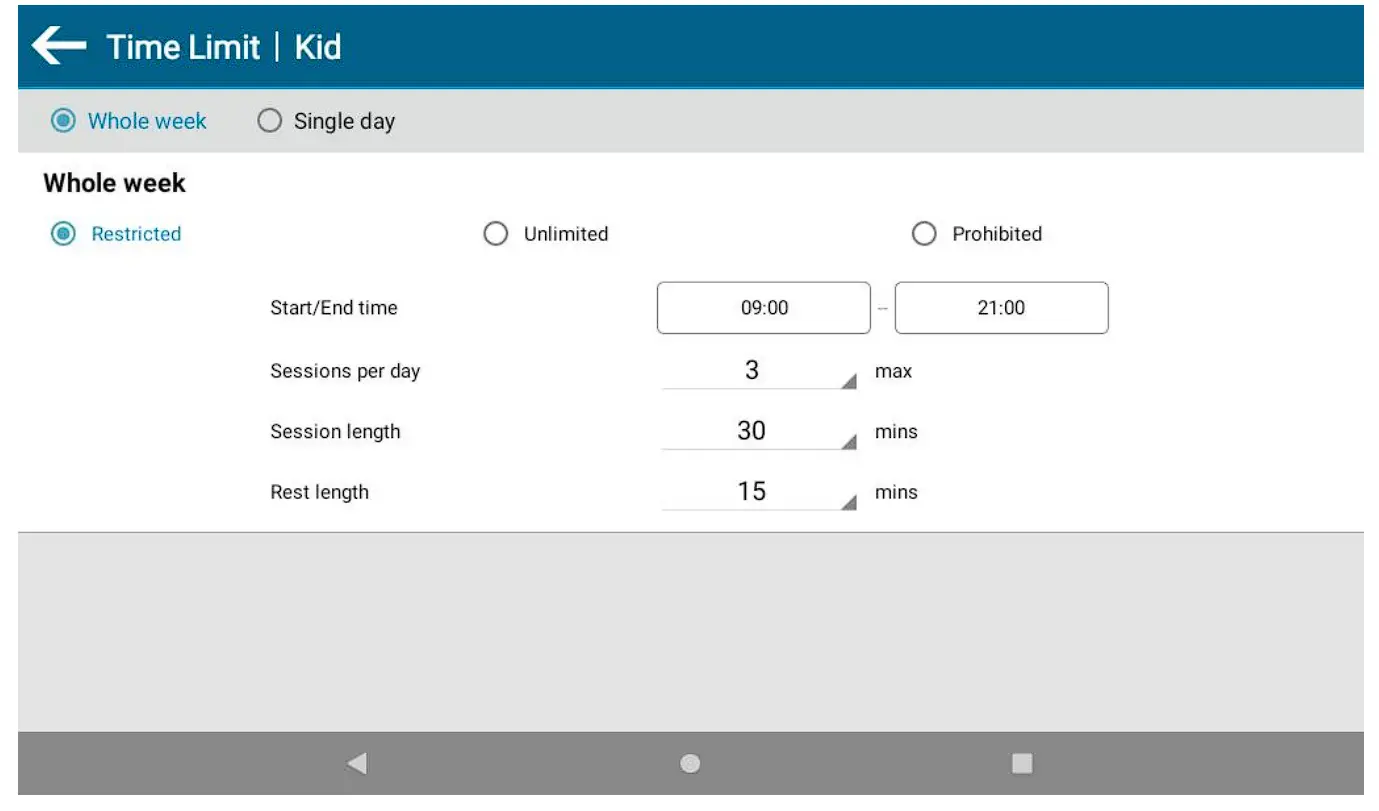 This section allows you to define the time limits you wish your little one to apply to the profile. Session Control allows you to define the play time per session and the rest time in between sessions, while Global Control defines a start time and stop time during the day.