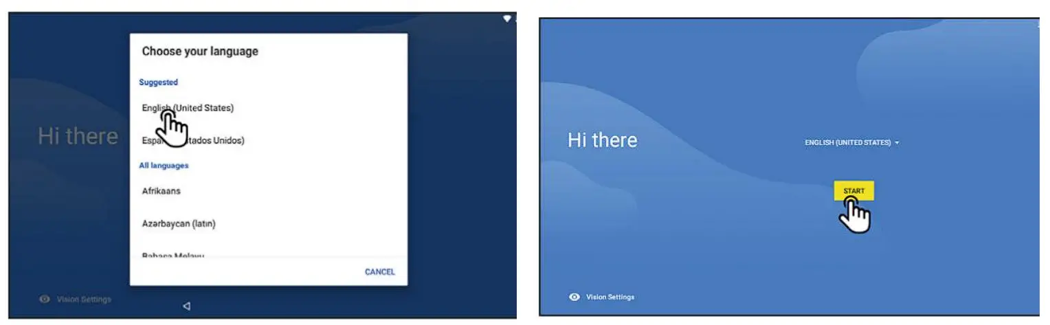 Language selection: scroll through the list of languages to choose your preferred language then tap Start.