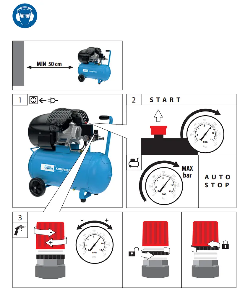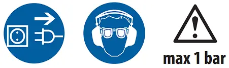 - Safety goggles should be worn when using the compressor in order to protect the eyes against any foreign bodies lifted by the jet of air.