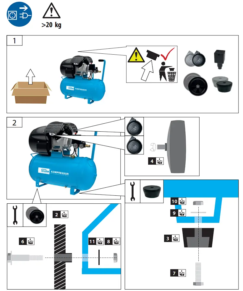 - Caution! The compressor may only be used with appropriate wheels and rubber bumps.