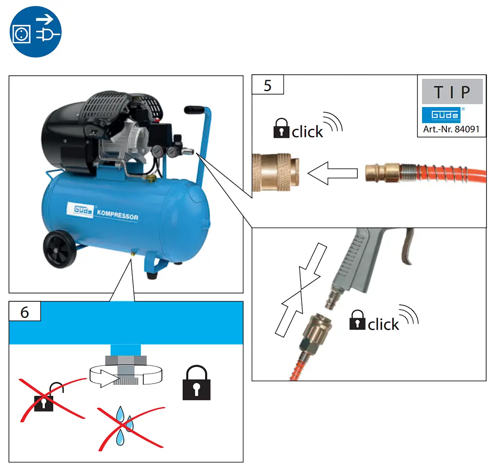 | Compressor being overheated and keeps switching off | Compressor is overloaded | Contact the Güde service centre |