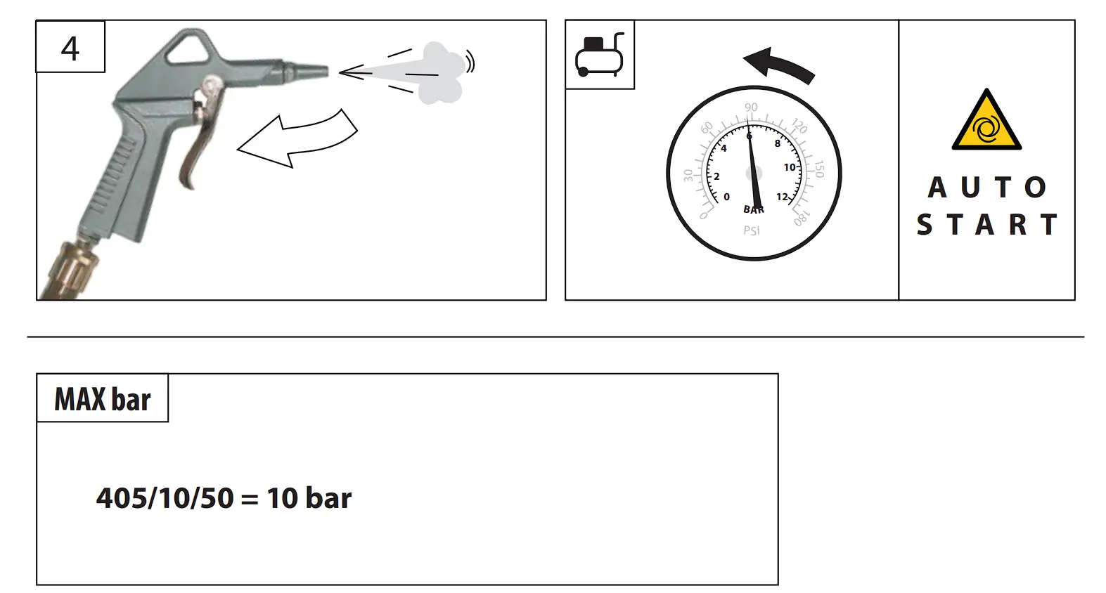 - When using compressed air, you must know and comply with the safety precautions to be adopted for each type of application (inflation, airpowered tools, painting, washing with water-based detergents only, clinching, etc.).