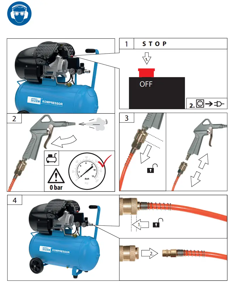 | Safety valve blowing off | Pressure in the air jet exceeds the set cut-off pressure | Have the pressure switch adjusted/re- placed by an authorised person (Güde service centre) |