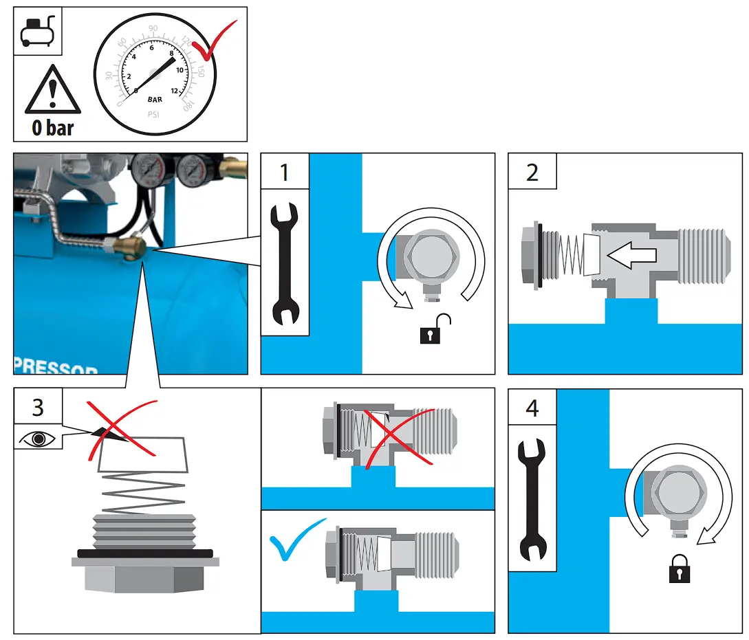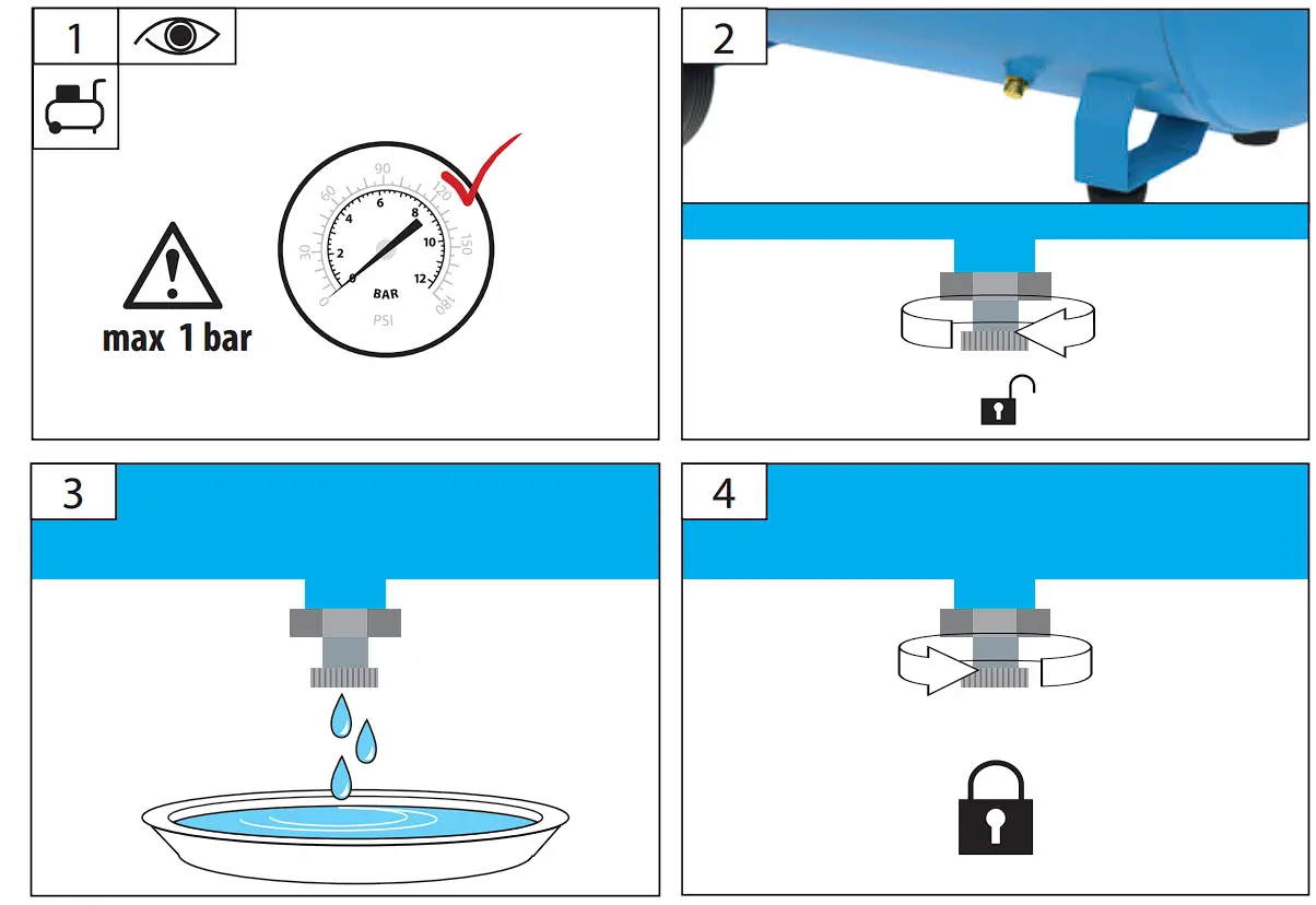 - At the end of your working day, switch the appliance off, release the air jet and unplug the compressor. Warning: if the water that condenses is not drained, it may corrode the receiver, reducing its capacity and impairing safety.