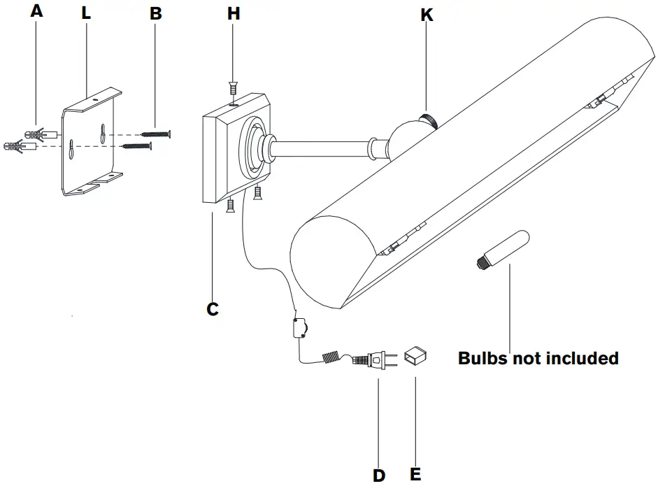 - Install portable mounting plate (L) to wall anchors using wood screws (B). then secure fixture body (C) to portable mounting plate (L) using screws (H).